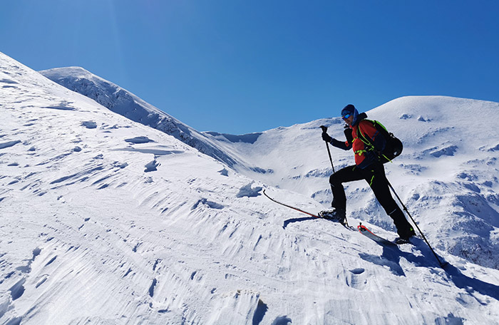 Odpowiednio dobrane ubranie podczas skitury jest bardzo ważnym aspektem, aby wycieczkę zaliczyć do udanych. Bardzo często zdarza się, że mniej doświadczeni narciarze ubierają się na skiturę tak jak do klasycznej jazdy na nartach, czyli za ciepło. To błąd!!! Zasada ubioru na cebulkę doskonale sprawdza się podczas tego typu aktywności. Podczas podejścia, już po pokonaniu pierwszych 100 m przewyższenia bardzo często należy zdjąć większość warstw ubioru, aby się nie przegrzać. W plecaku zawsze powinna znaleźć się kurtka membranowa, która doskonale chroni przed wiatrem i opadem śniegu, a także docieplenie w postaci kurtki lub puchowego swetra. Nie zapomnijmy również o dwóch, trzech parach rękawiczek – cienkie podczas podchodzenia, cieplejsze do zjazdu i bardzo ciepłe do ogrzania rąk podczas dłuższego postoju.