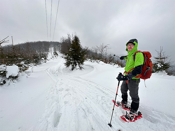 Gdy tylko minęliśmy ostatnie zabudowania Zwardonia i zaczęliśmy wdrapywać się na Skalankę, zgodnie uznaliśmy, że pora wyciągnąć rakiety, które wcześniej cierpliwie czekały na swoją kolej, przytroczone do naszych plecaków. Szybkie przepakowanie i już zaczynaliśmy zapinać nasze buty do rakiet. Poprzedniego dnia, jeszcze w domu zrobiliśmy odpowiednie przymiarki, aby móc łatwiej i szybciej założyć je w terenie. Dzięki temu uniknęliśmy długiego postoju, nie wystawiając się na zimny wiatr panujący w górach, który szczególnie doskwiera naszym rękom, gdy tylko zdejmiemy rękawiczki, by dokonać niezbędnych precyzyjnych czynności.