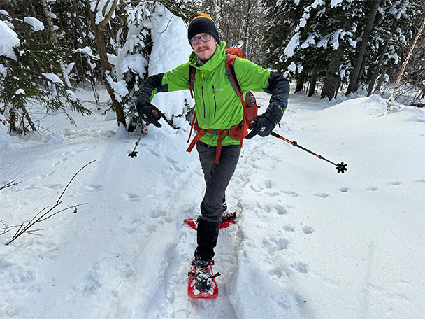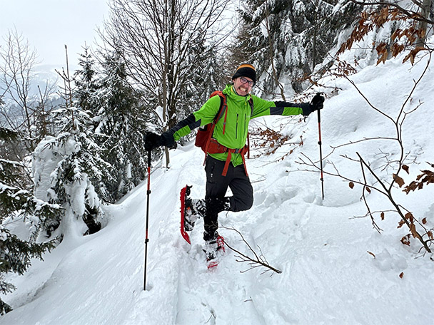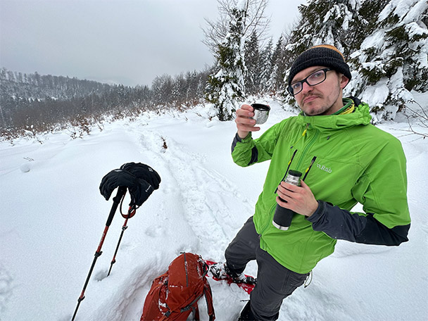 Poza ciepłym i oddychającym ubiorem, składającym się z kilku warstw oraz odpowiednim obuwiem, wypożyczyliśmy rakiety śnieżne. Wcześniej miałem z nimi do czynienia bardziej w teorii niż w praktyce, jednak oglądałem i czytałem sporo materiałów na temat ich użytkowania. Sprzęt okazał się na tyle intuicyjny, że dzięki wcześniejszemu korzystaniu ze skitourów oraz raków, obsługa rakiet nie była dla mnie kłopotliwa. Podobnie było z kumplem, który pomimo bardzo małego doświadczenia górskiego wraz z moją pomocą, bardzo szybko załapał, o co w tym wszystkim chodzi.