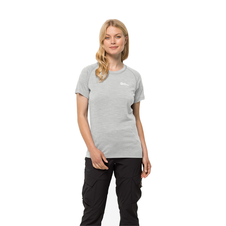 Damska koszulka wykonana z połączenia poliestru i wełny Merino. Wełna MERINO absorbuje wilgoć i odprowadza ją z dala od ciała oraz zapewnia uczucie świeżości oraz efekt lekkiego chłodzenia. Jednocześnie materiał ten ogranicza powstawanie nieprzyjemnych zapachów.