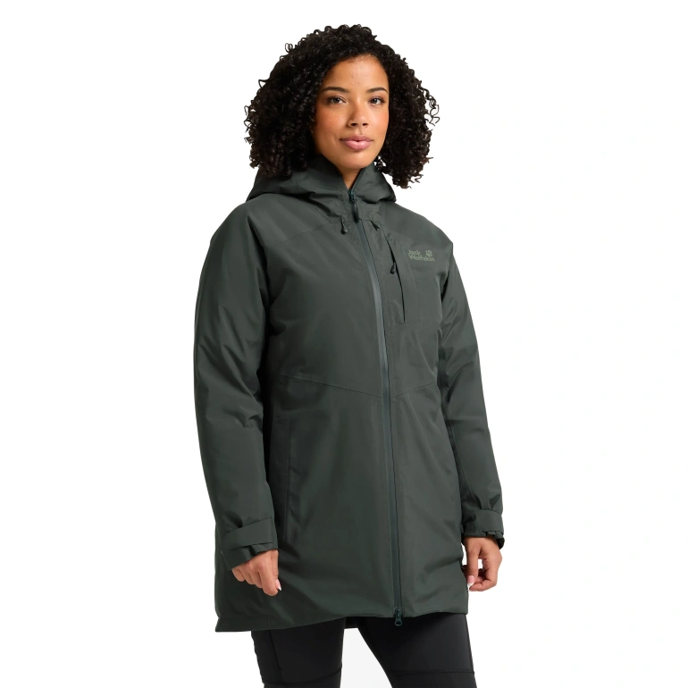Lekko przedłużony krój podkreślający damską sylwetkę lecz nie krępujący ruchów. To kurtka zimowa kurtka z nieprzemakającym materiałem zewnętrznym TEXAPORE ECOSPHERE PRO i ciepłym, naturalnym wypełnieniem z puchu kaczego w stosunku 90/10 (puch do pierza). Całość zapewnia świetną termikę przy jednoczesnym zachowaniu wodoszczelności i oddachalności (odprowadzenie wilgoci na zewnątrz materiału). Ponadto zintegrowany, w pełni regulowany kaptur, mankiety i ściągacz do regulacji obwody pozwolą na odpowiednie dopasowanie kurtki.